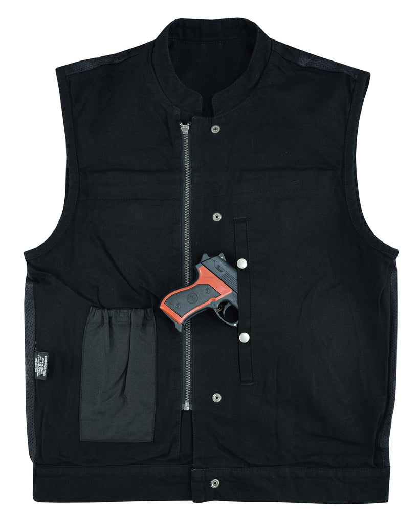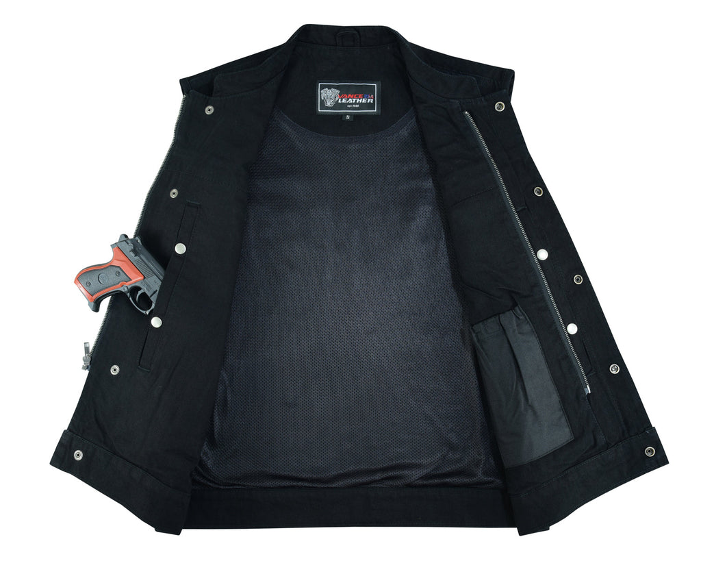 The SOA Style Black Denim Club Vest is a must-have for all motorcycle enthusiasts. This vest features a classic mandarin collar and a hidden zipper and snap front closure for a sleek and secure fit. The two outside front snap pockets and two hand warmer pockets offer plenty of storage options. The single back panel is perfect for showcasing your favorite patches, and the fixed polyester lining ensures durability and comfort. The vest also includes an inside accessory pocket with snap closure and an inside concealed carry pocket with snap closure for added convenience and security. this vest is perfect for riders of all ages and is an essential piece for any biker's wardrobe.