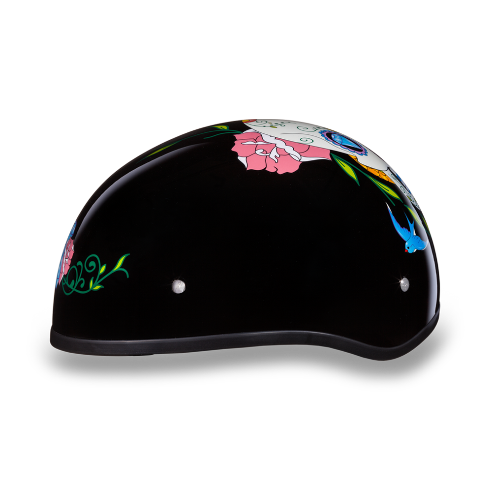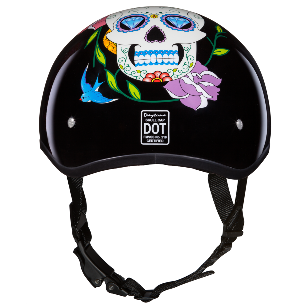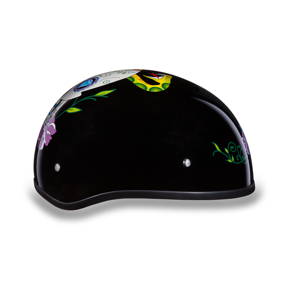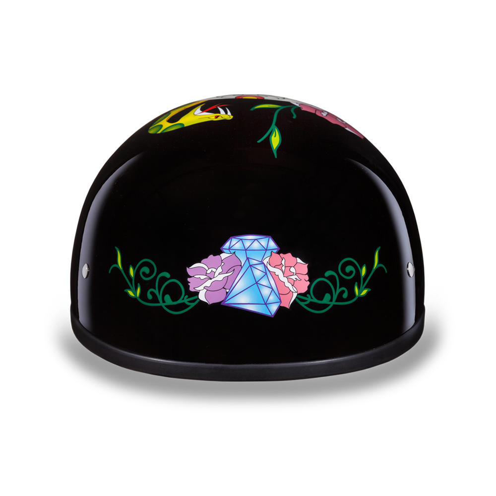 Our D.O.T. Daytona Slim Line Skull Cap 1/2 Shell Helmet In The Diamond Skull Graphic, Meets And Exceeds D.O.T. FMVSS 218 Standards And Is The Smallest D.O.T. 1/2 Shell Helmet Ever Made!! With 3 Different Shell Sizes, You're Sure To Get That Proportionate Fit!! Each Graphic Item Is Custom Designed And May Vary In Color Or Composition. Available Without Snaps/Visor Only. Many More Colors And Designs Available Such As Soft Touch Dull Black, Hi-Gloss Black, Hi-Gloss White And Hi-Gloss Pink; Custom Colors: Black Cherry, Gun Metal Grey Metallic, Pearl White And Silver Metallic; Specialty Items: Carbon Fiber And Leather. Free Head Wrap And Cloth Draw String Bag Included. Sizes Range From 2XS-2XL.