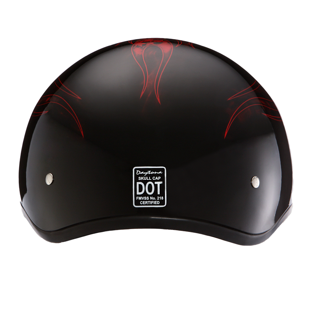 Our D.O.T. Daytona Slim Line Skull Cap 1/2 Shell Helmet In The Skull Flames Red Graphic, Meets And Exceeds D.O.T. FMVSS 218 Standards And Is The Smallest D.O.T. 1/2 Shell Helmet Ever Made!! With 3 Different Shell Sizes, You're Sure To Get That Proportionate Fit!! Each Graphic Item Is Custom Designed And May Vary In Color Or Composition. Available Without Snaps/Visor Only. Many More Colors And Designs Available Such As Soft Touch Dull Black, Hi-Gloss Black, Hi-Gloss White And Hi-Gloss Pink; Custom Colors: Black Cherry, Gun Metal Grey Metallic, Pearl White And Silver Metallic; Specialty Items: Carbon Fiber And Leather. Free Head Wrap And Cloth Draw String Bag Included. Sizes Range From 2XS-2XL.