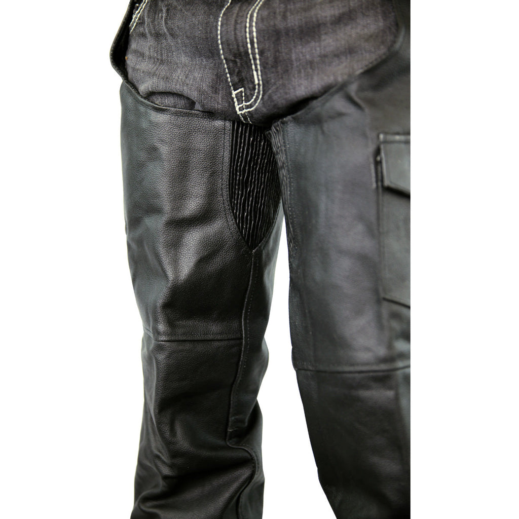 Made from premium-quality leather, the chaps are built to last and provide superior protection. The adjustable front belt and back lace allow for a customized fit, ensuring maximum comfort and support during your ride. The cargo-style pocket provides ample storage space for your essentials, while the inner thigh stretch panels offer optimal flexibility and ease of movement. The zip-out quilted thermal lining keeps you warm in cold weather, making our chaps ideal for all seasons. Heavy-duty YKK metal zippers ensure a secure closure, while the fixed nylon lining adds an extra layer of protection. The zippers on the sides are covered with a wind flap to prevent wind from entering, while the snaps at the bottom make it easy to put on and take off with shoes on. Plus, the extra-long leg cut can be tailored to fit your exact length with household shears, eliminating the need for hemming. Whether you're a man or woman, our chaps are perfect for motorcycle riders of all ages.