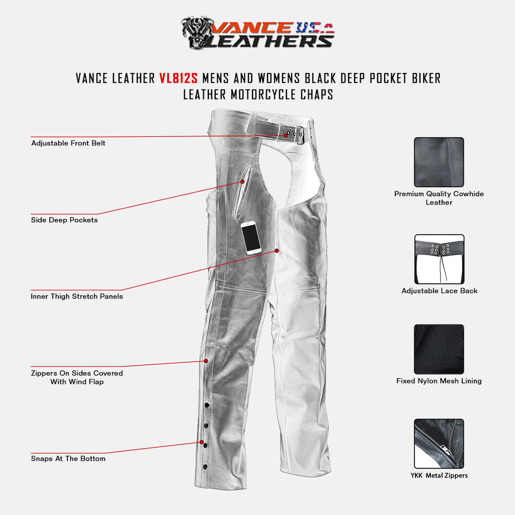 Vance Leather Unisex Black Deep Pocket Biker Leather Motorcycle Chaps.