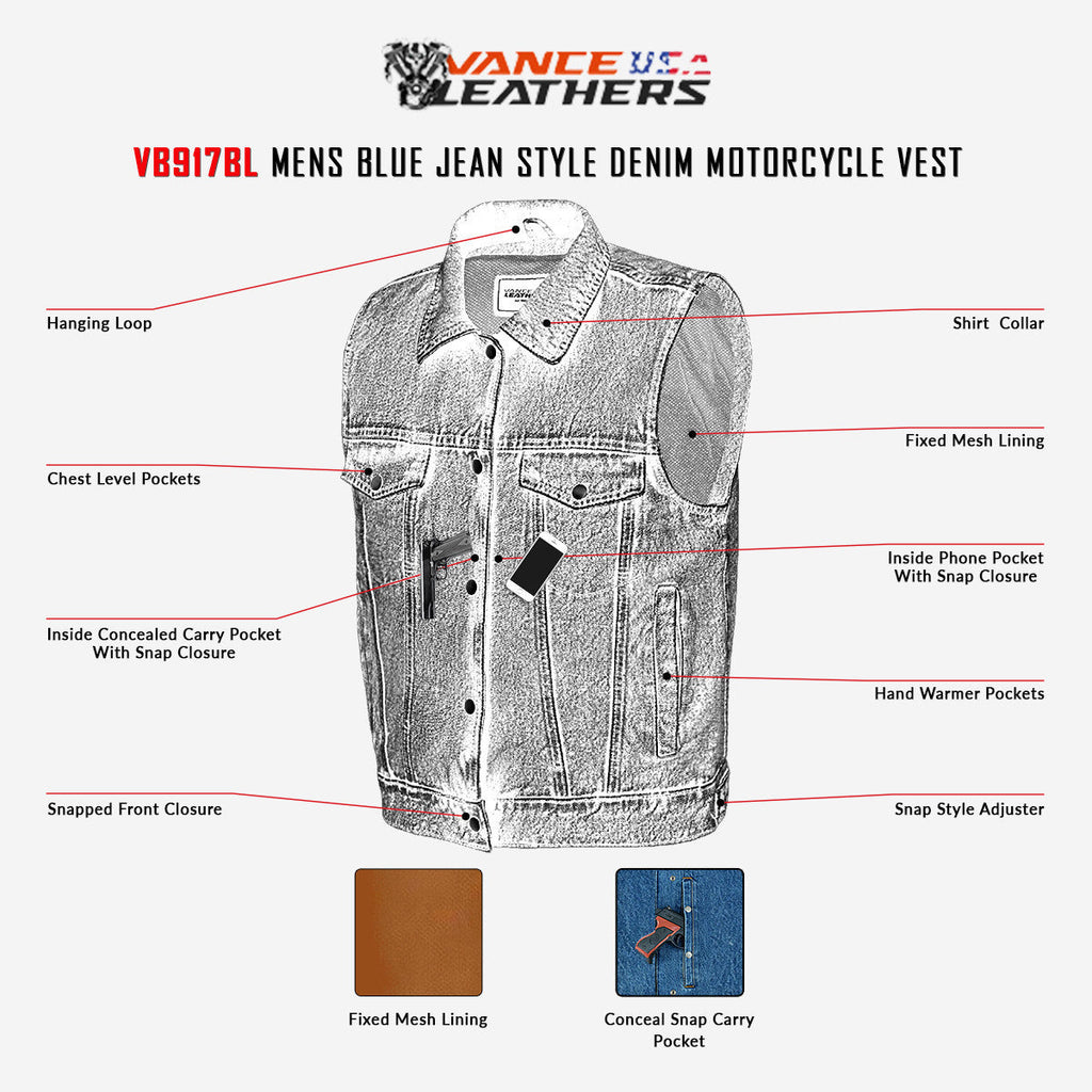 Vance Mens Blue Jean Style Denim Motorcycle Vest.