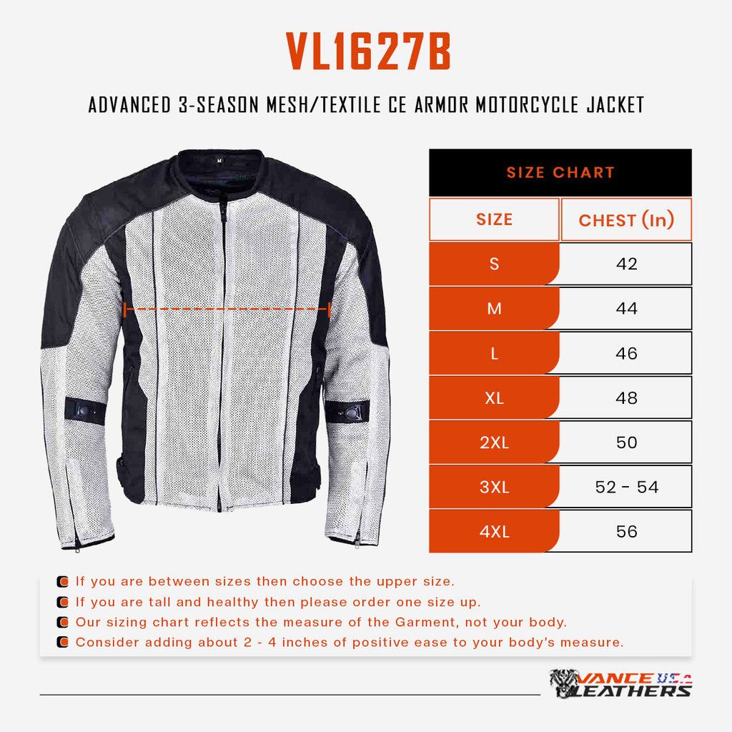 Advanced Vance 3-Season Mesh/Textile CE Armor Motorcycle Jacket - size chart
