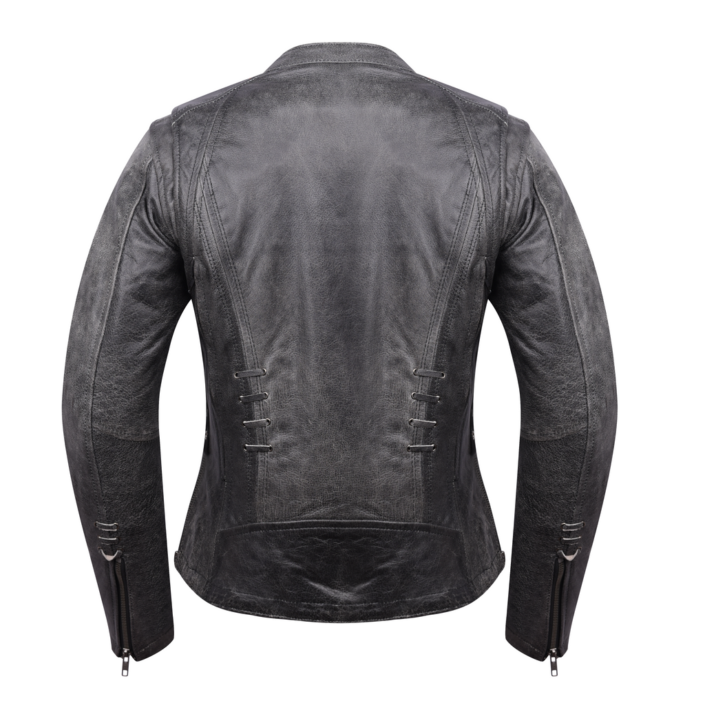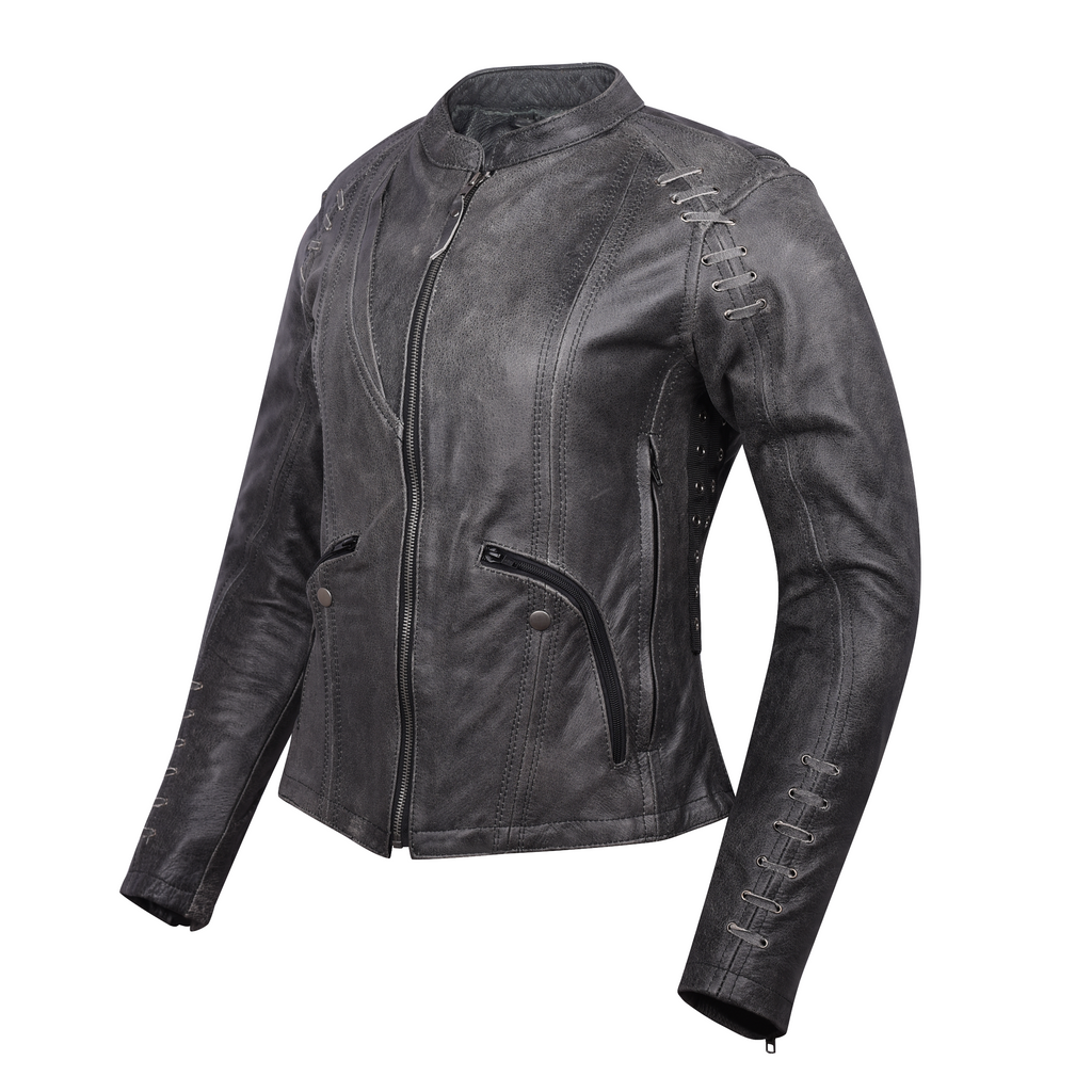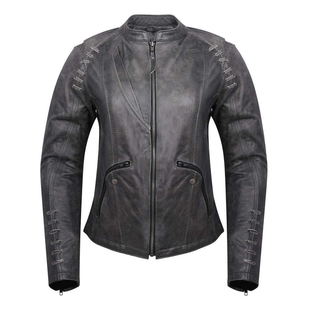 High Mileage HML638DG Women's Lace and Grommet Detail Distressed Gray Goat Skin Leather Lady Biker Motorcycle Fashion Jacket.
