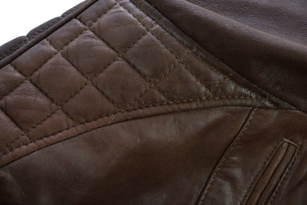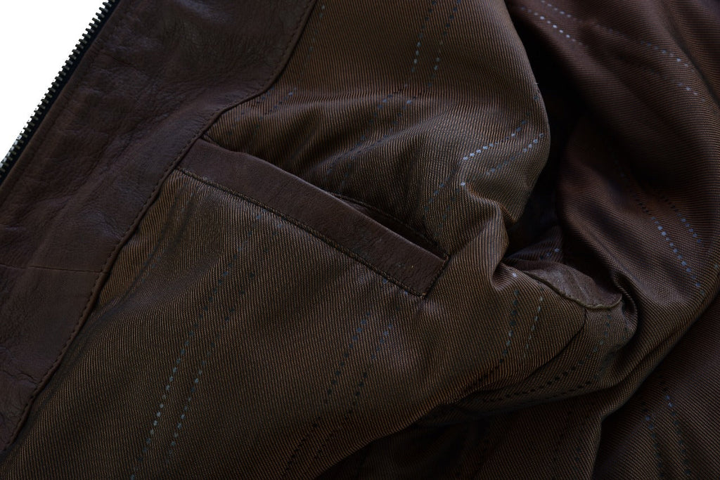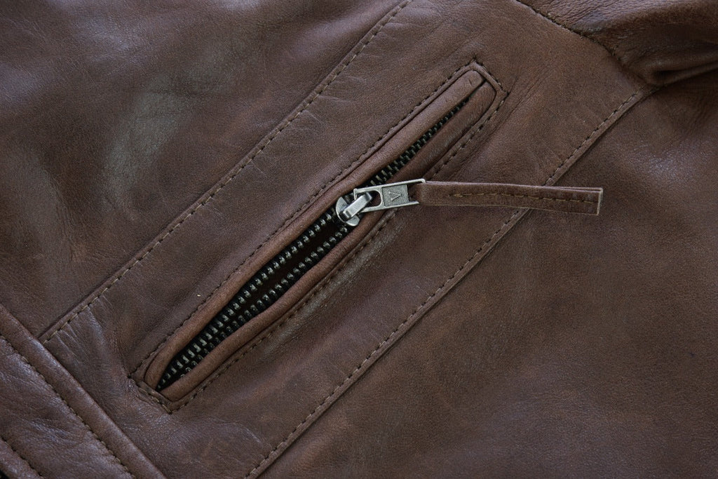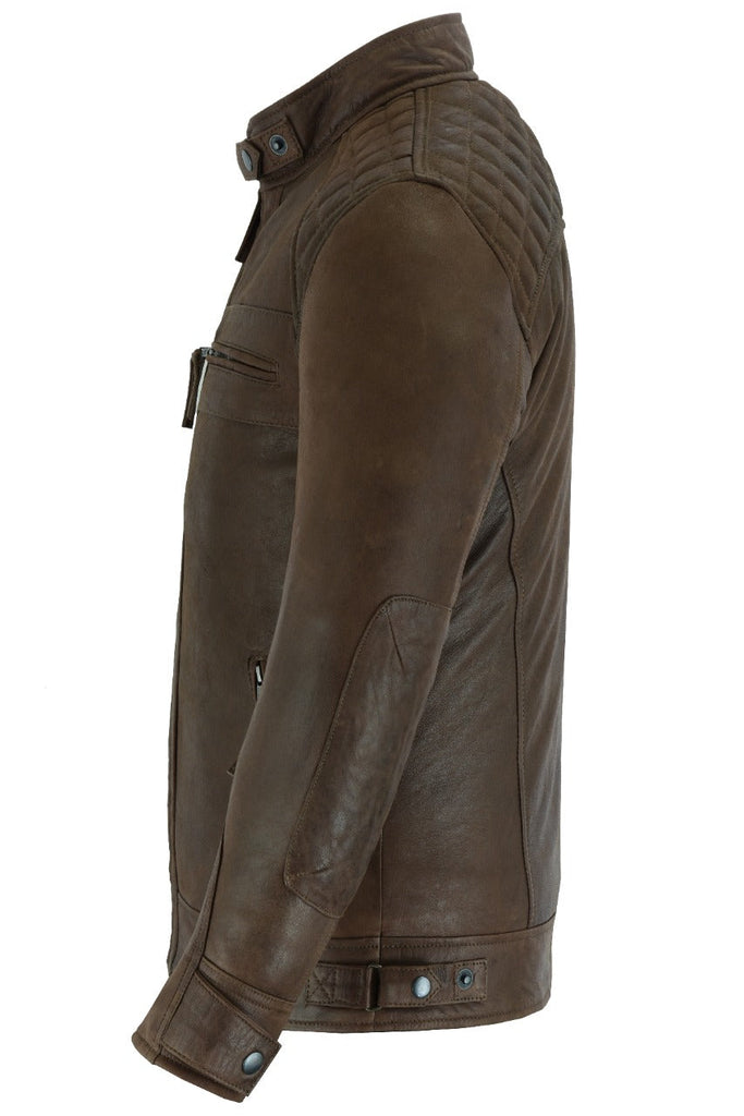 The Vance Leather Men's Cafe Racer Waxed Lambskin Chocolate Brown Motorcycle Leather Jacket exudes a rugged and classic appeal. Crafted from top-quality lambskin leather, this jacket offers both style and protection for motorcycle enthusiasts. Its rich brown color and cafe racer design make it a standout choice for riders.