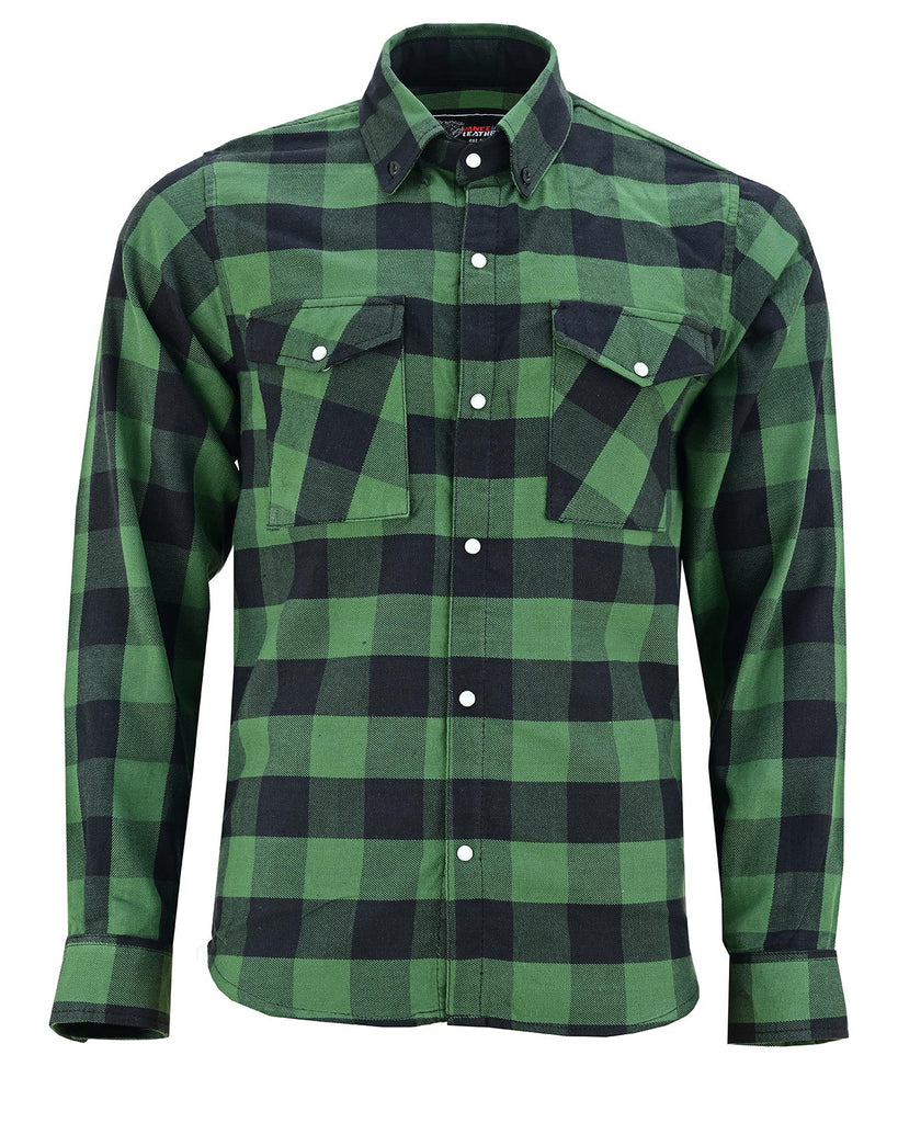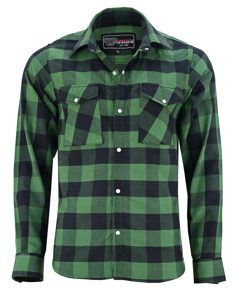 Our Green & Black Snap-Down Flannel Shirt, designed for bikers, adventurers, and hardworking individuals who demand both comfort and durability. Featuring a Green and black plaid pattern, this flannel offers a classic look, perfect for riding, outdoor work, or casual everyday wear.