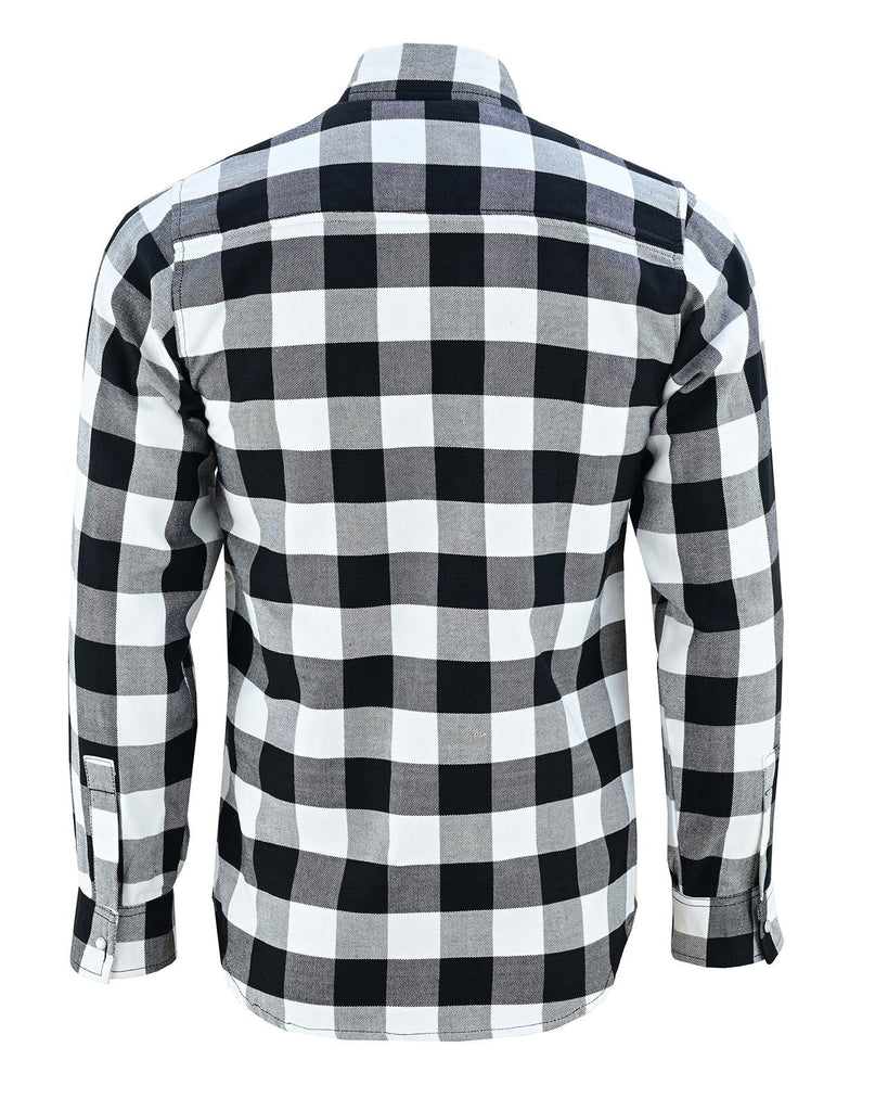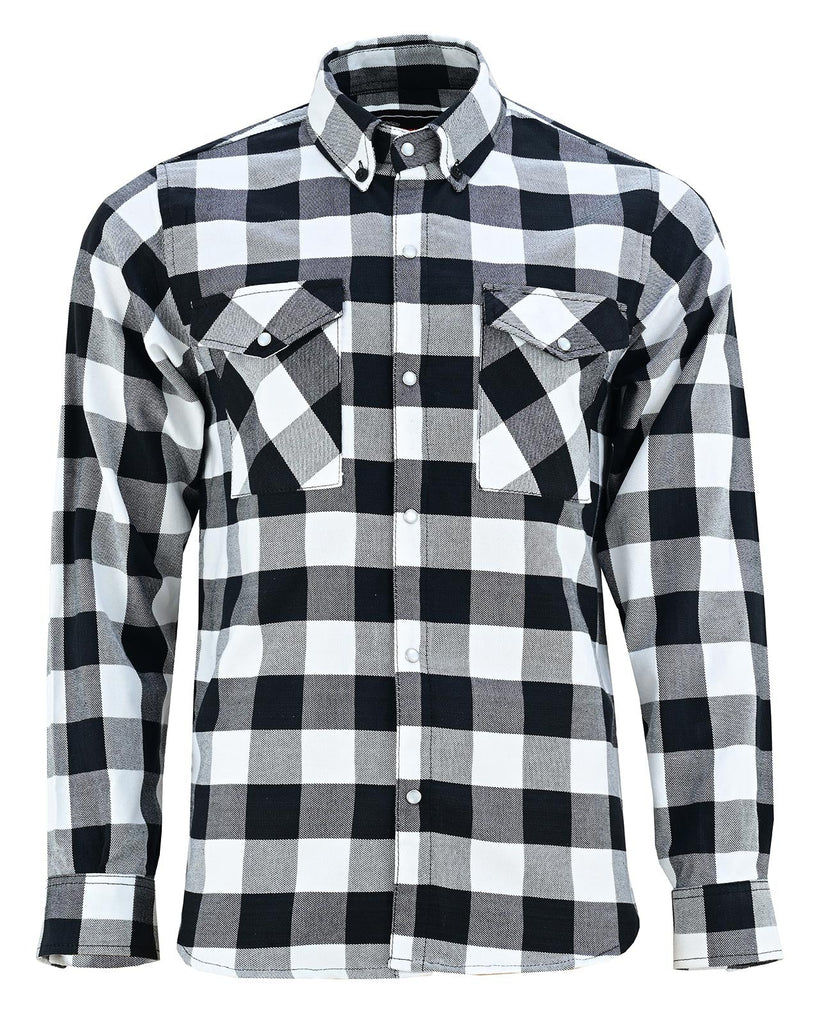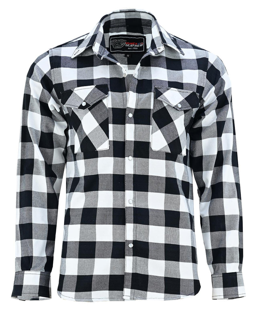 Our White & Black Snap-Down Flannel Shirt, designed for bikers, adventurers, and hardworking individuals who demand both comfort and durability. Featuring a White and black plaid pattern, this flannel offers a classic look, perfect for riding, outdoor work, or casual everyday wear.