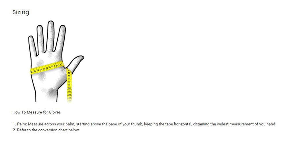 - Palm: Measure across your palm, starting above the base of your thumb, keeping the tape horizontal, obtaining the widest measurement of you hand