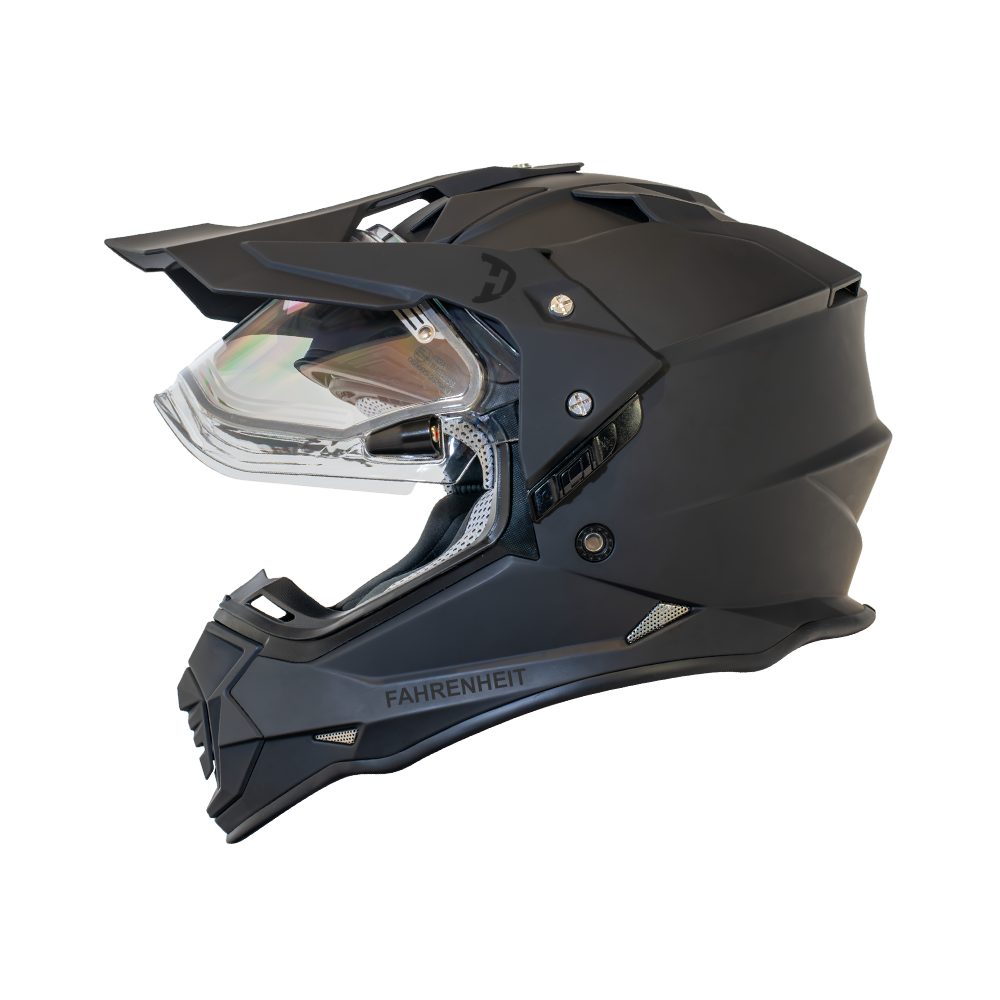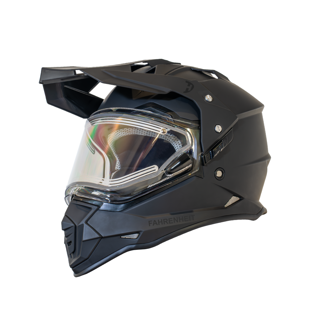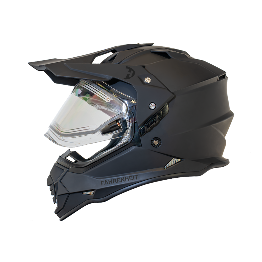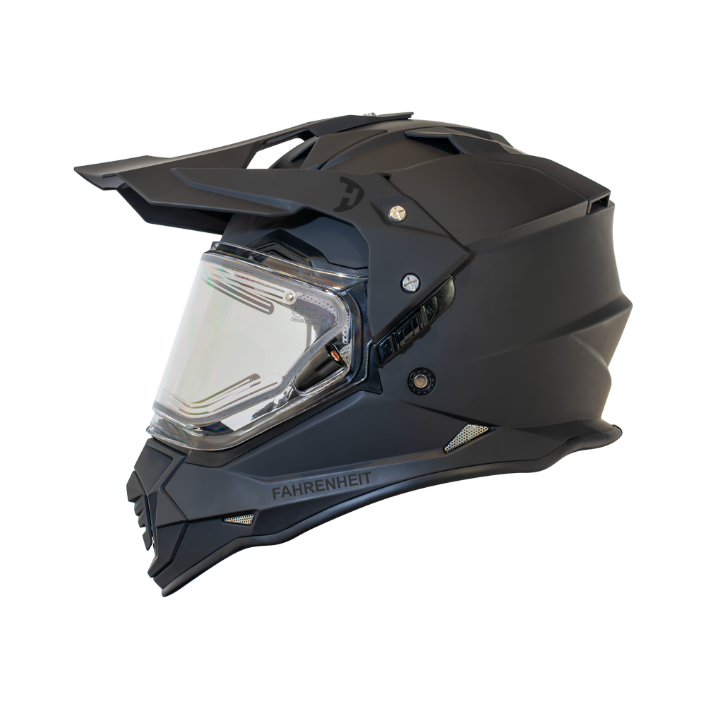 Our D.O.T. Daytona Fahrenheit Snowmobile Helmet, With Outer Electric Heated Clear Shield, In Soft Touch Dull Black, Meets And Exceeds D.O.T. FMVSS 218 Standards. Features A Dual Shield System; Outer Anti-Fog Electric Heated Dual Pane Clear Shield And Inner Anti-Scratch Retractable Smoke Shield. Also Has A Quick Release Lock Retention System; One Finger Release Lever For Easy Detachment, Adjustable Chin Ventilation, A Removable Aerodynamic Visor And A Removable, Hand Washable Interior (Moisture Wicking Fabric). Bluetooth Compatible. Free Draw String Bag Included. Sizes Range From XS-3XL.