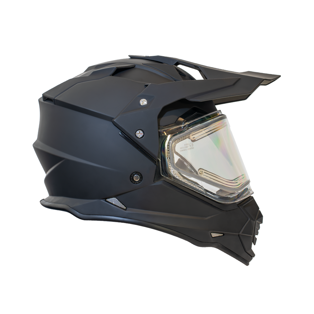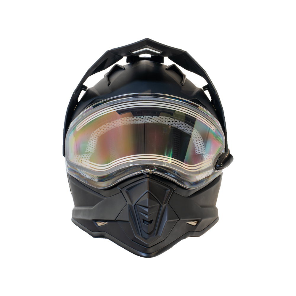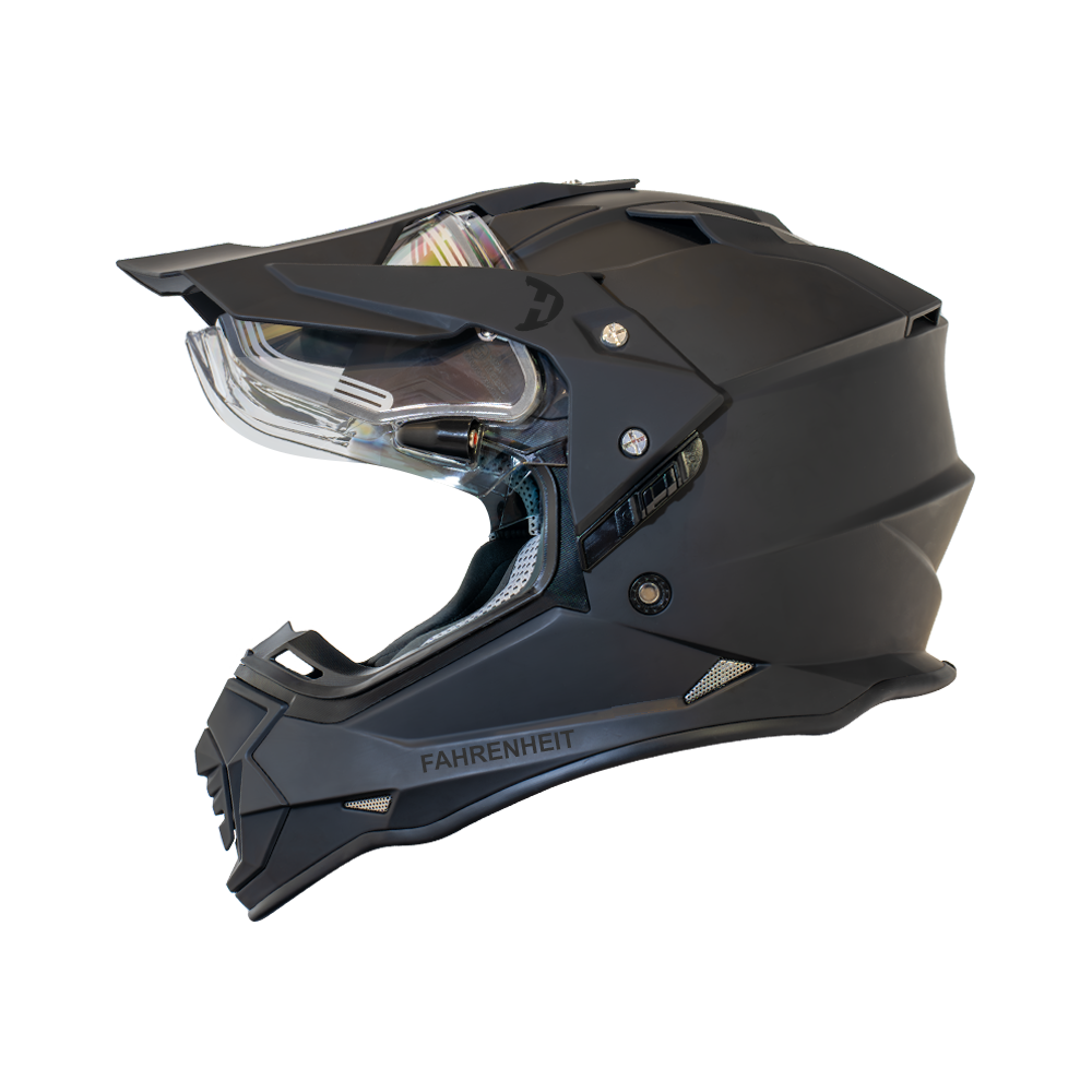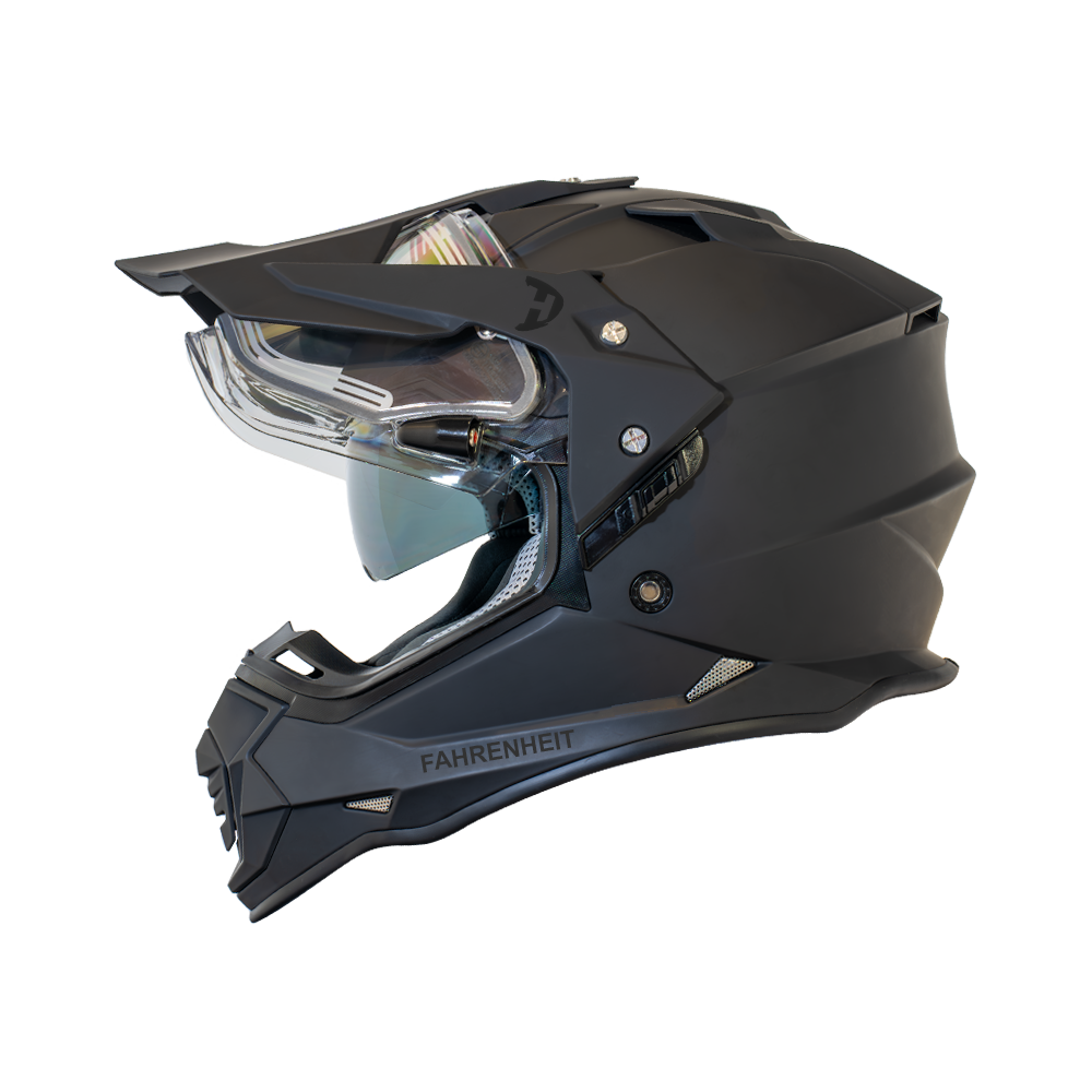 Our D.O.T. Daytona Fahrenheit Snowmobile Helmet, With Outer Electric Heated Clear Shield, In Soft Touch Dull Black, Meets And Exceeds D.O.T. FMVSS 218 Standards. Features A Dual Shield System; Outer Anti-Fog Electric Heated Dual Pane Clear Shield And Inner Anti-Scratch Retractable Smoke Shield. Also Has A Quick Release Lock Retention System; One Finger Release Lever For Easy Detachment, Adjustable Chin Ventilation, A Removable Aerodynamic Visor And A Removable, Hand Washable Interior (Moisture Wicking Fabric). Bluetooth Compatible. Free Draw String Bag Included. Sizes Range From XS-3XL.