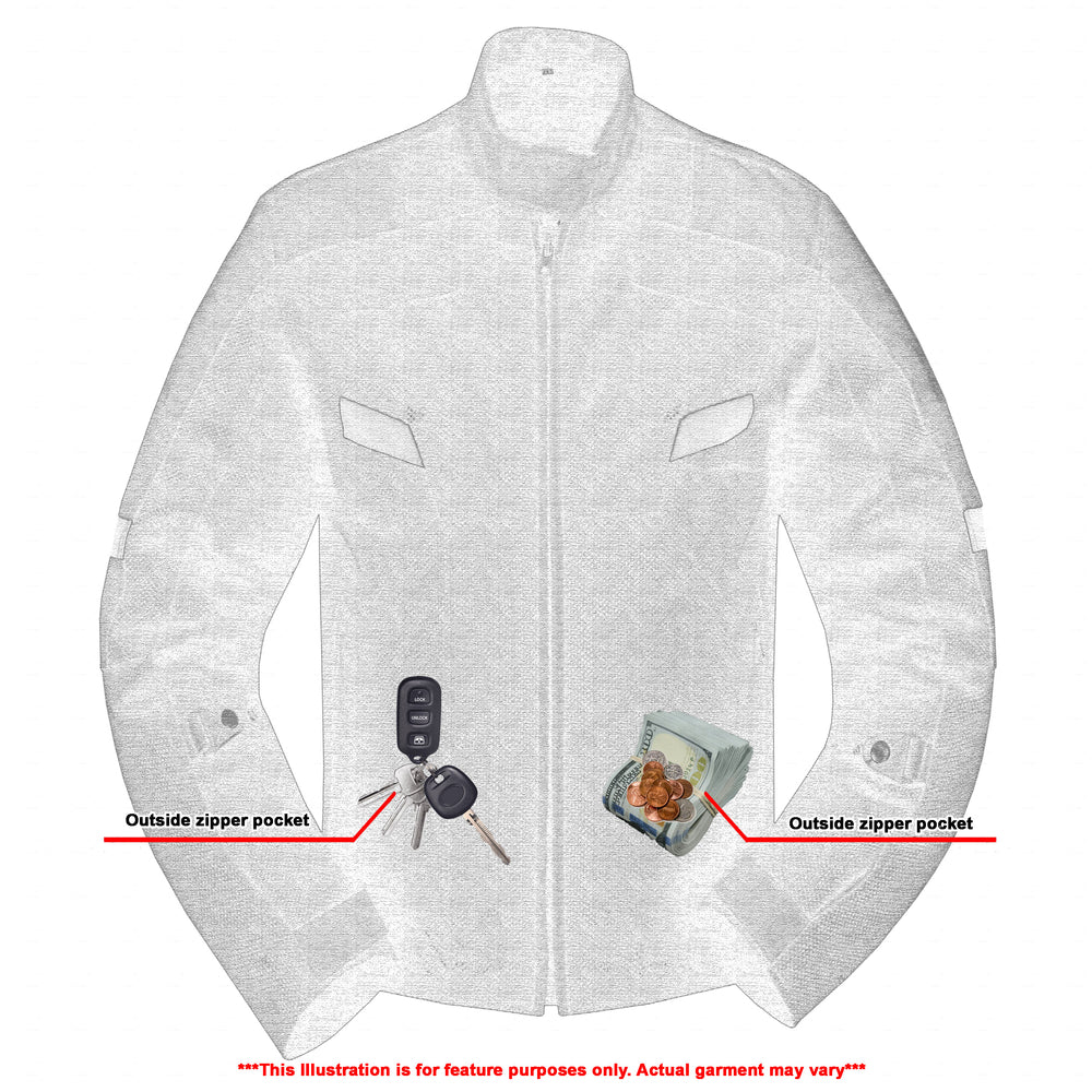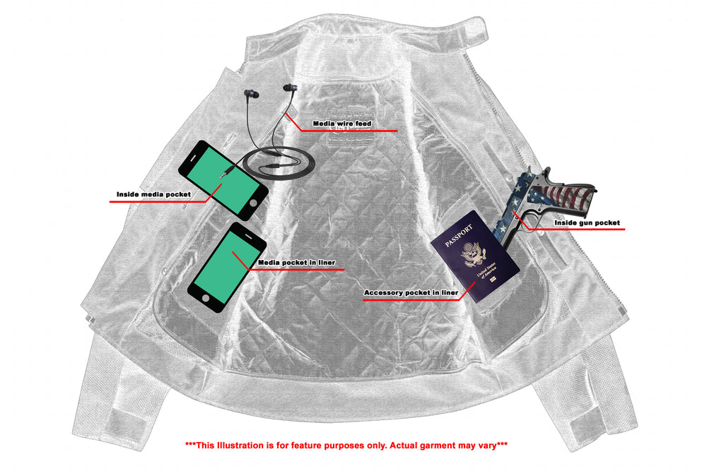 1 inside left-hand side concealed gun pockets made of special heavy-duty textile with built-in holsters and snap closure.