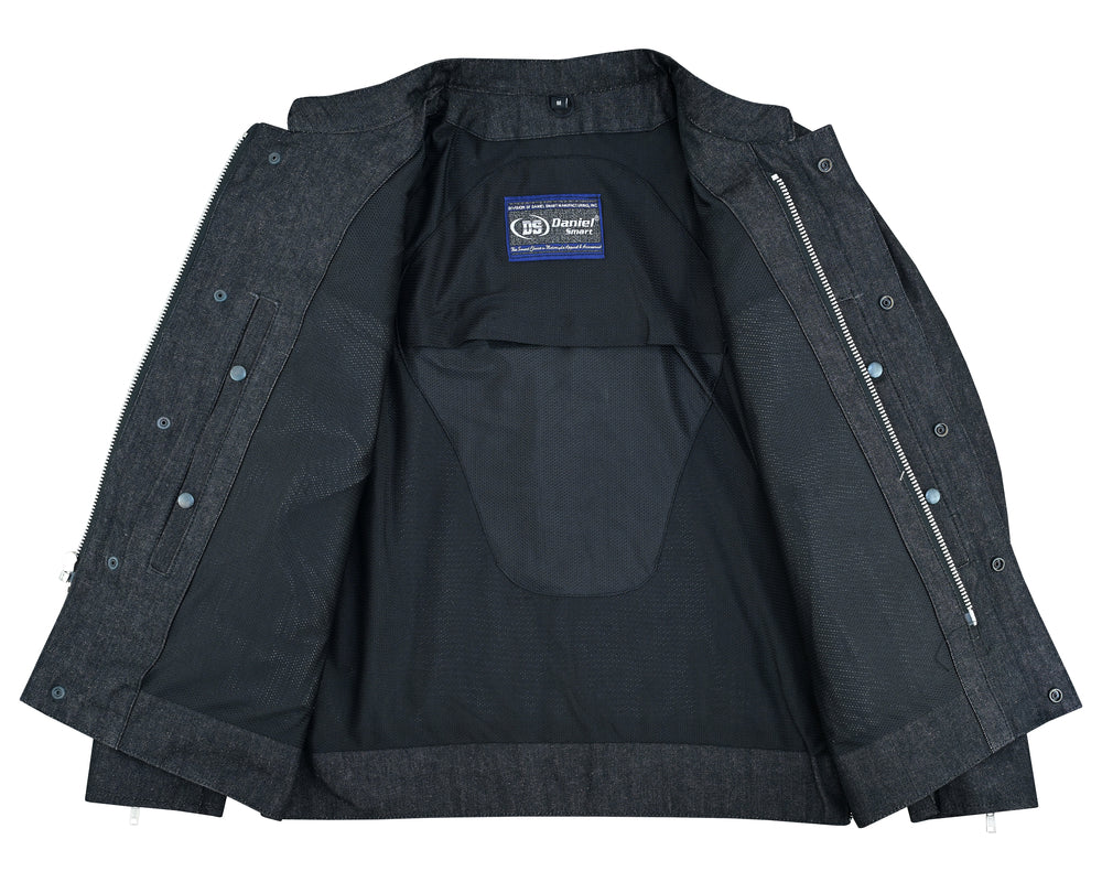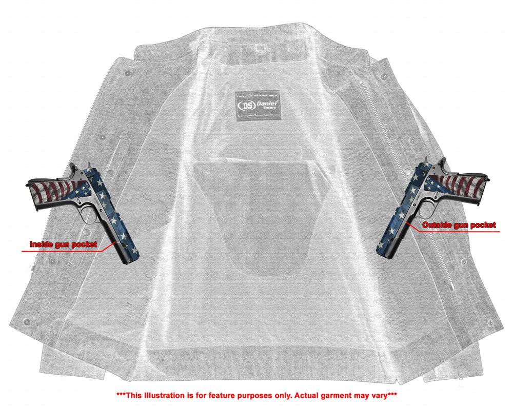 2 upgraded style concealed gun pockets between the snap and the zipper made of special heavy-duty textile with built-in holsters and snap closure.