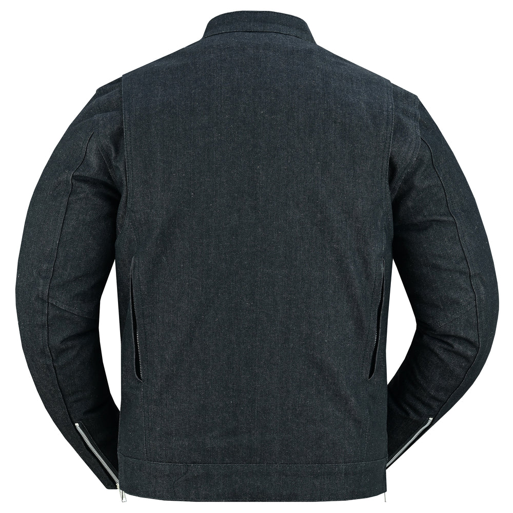 Front silver metal zipper hidden under snap-placket blocks wind & rain.