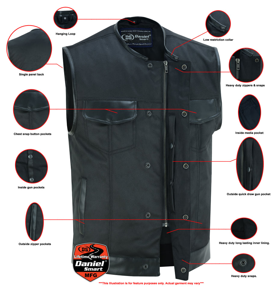 2 upgraded style concealed gun pockets between the snap and the zipper made of special heavy duty textile with built-in holsters and snap closure.