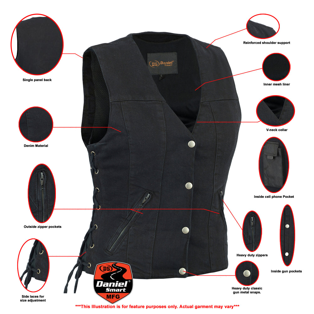Our women's black denim concealed carry biker vest offers the high quality and versatility you want on the road. It includes a single-panel back perfect for accessorizing with airbrushed art or club logos and patches. You can get the fit you like with our side laces, which allow for precise adjustments. The vest has two outside zippered pockets as well as two inside concealed gun pockets, which are made from unique heavy-duty textiles and include built-in holsters and a snap closure.