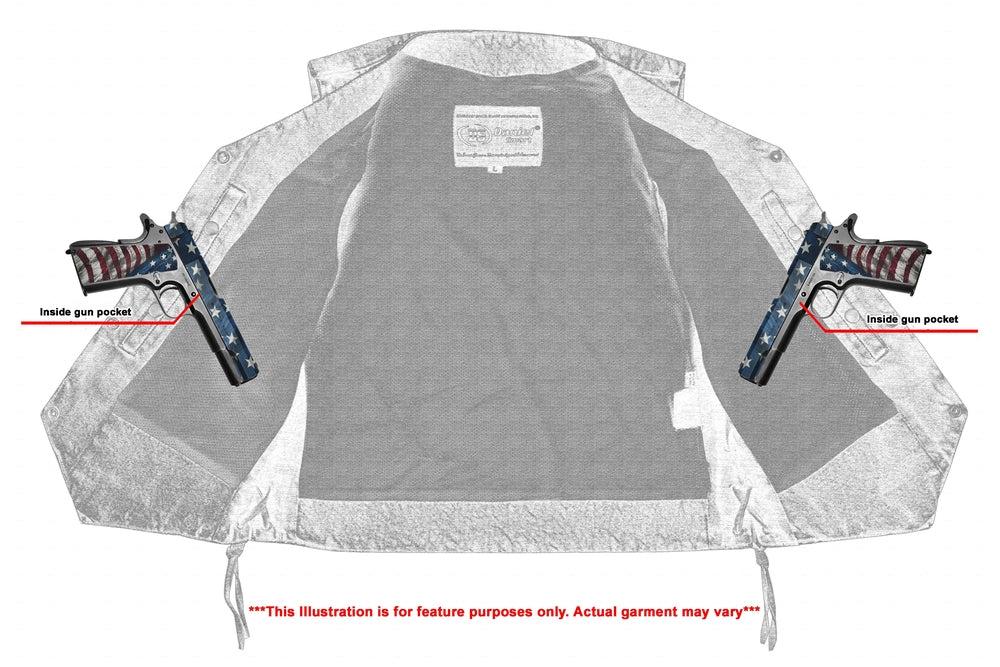 2 inside concealed gun pockets made of special heavy-duty textile with built-in holsters and snap closure.