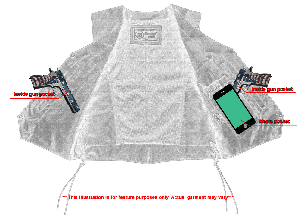 2 inside concealed gun pockets made of special heavy-duty textile with built-in holsters and snap closure.