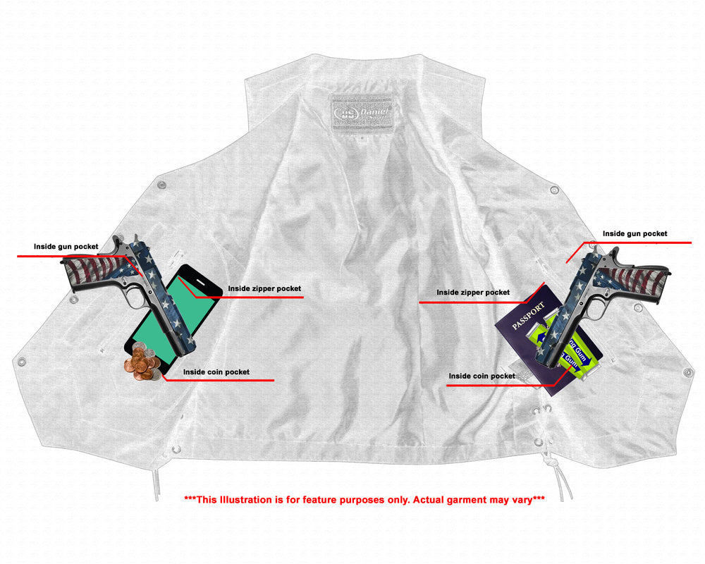 Built in dual side concealed gun pockets with built-in holsters and snap closure.