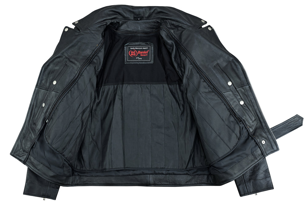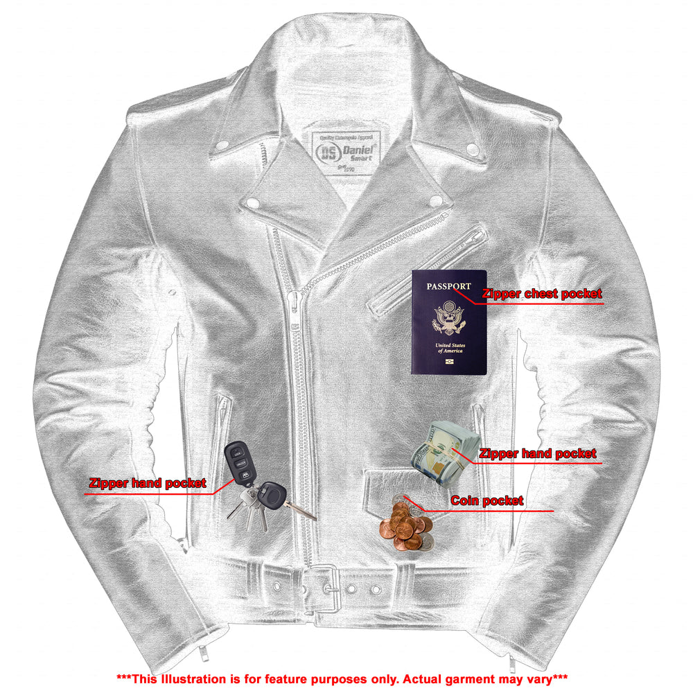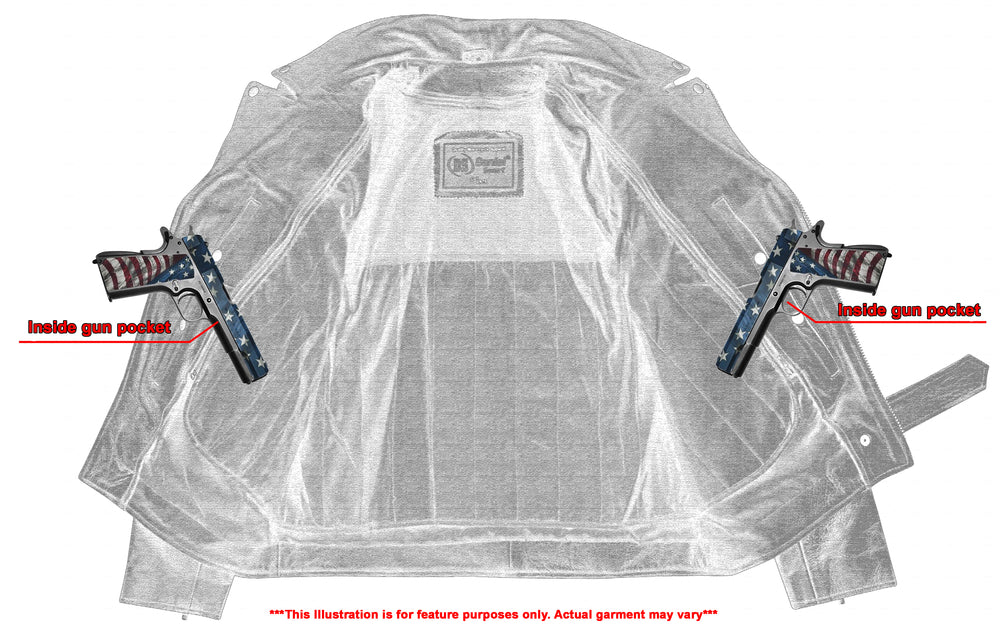 2 upgraded style concealed gun pockets between the snap and the zipper made of special heavy duty textile with built-in holsters and snap closure.